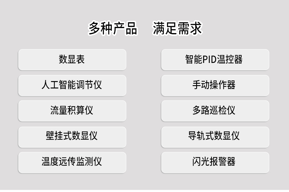 數顯儀表與溫控器 顯示控制儀 模糊PID溫控器 人工智能調節儀 手動操作器 流量積算儀 數字顯示容積儀 多路巡檢儀 導軌式數顯表 導軌式溫控器 導軌式數顯溫度變送器 導軌流量積算儀 導軌多路巡檢儀 壁掛式數顯表 壁掛式溫控器 閃光報警器 移相觸發器 固態繼電器