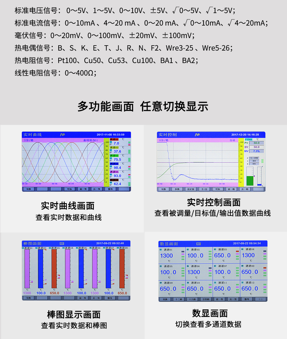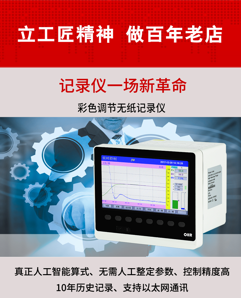 OHR-H300系列彩色調(diào)節(jié)無(wú)紙記錄儀采用真正的人工智能算式,儀表啟動(dòng)自整定功能,可根據(jù)被控對(duì)象的特性,自動(dòng)尋找最優(yōu)參數(shù)以達(dá)到很好的控制效果,無(wú)需人工整定參數(shù)。控溫精度基本達(dá)±0.1℃,無(wú)超調(diào)、欠調(diào),達(dá)國(guó)際先進(jìn)水平。24路萬(wàn)能輸入(可組態(tài)選擇輸入:標(biāo)準(zhǔn)電壓、標(biāo)準(zhǔn)電流、熱電偶、熱電阻、毫伏等)其中可帶8路控制輸入。