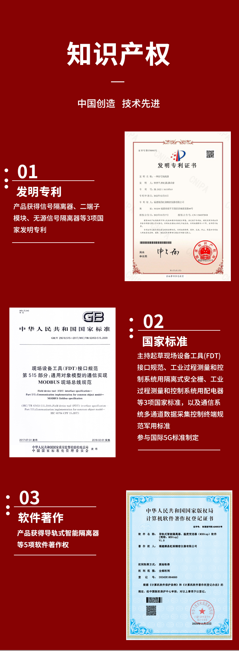 虹潤公司是專業生產隔離器的國家專精特新“小巨人”企業。生產的智能信號隔離器涵蓋電流電壓變送器、溫度變送器、配電器、頻率轉換器、開關量轉換器及通訊轉換器等多種產品類型。產品獲得信號隔離器、一種二端子模塊、無源信號隔離器等3項國家發明專利,主持起草現場設備工具(FDT)接口規范、工業過程測量和控制系統用隔離式安全柵、工業過程測量和控制系統用配電器等3項國家標準,以及通信系統多通道數據采集控制終端規范軍用標準,參與國際5G標準制定,取得導軌式智能隔離器、頻率轉換器等3項相關軟件著作權。產品廣泛電力、冶金、工業電爐、變電站、高壓電機房等需要電隔離的工業自動化控制系統。