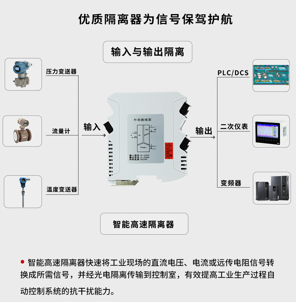OHR-M38系列智能高速隔離器將工業(yè)現(xiàn)場的直流電壓、電流或遠傳電阻信號轉(zhuǎn)換成所需信號,經(jīng)隔離傳輸?shù)娇刂剖遥行岣吖I(yè)生產(chǎn)過程自動控制系統(tǒng)的抗干擾能力。