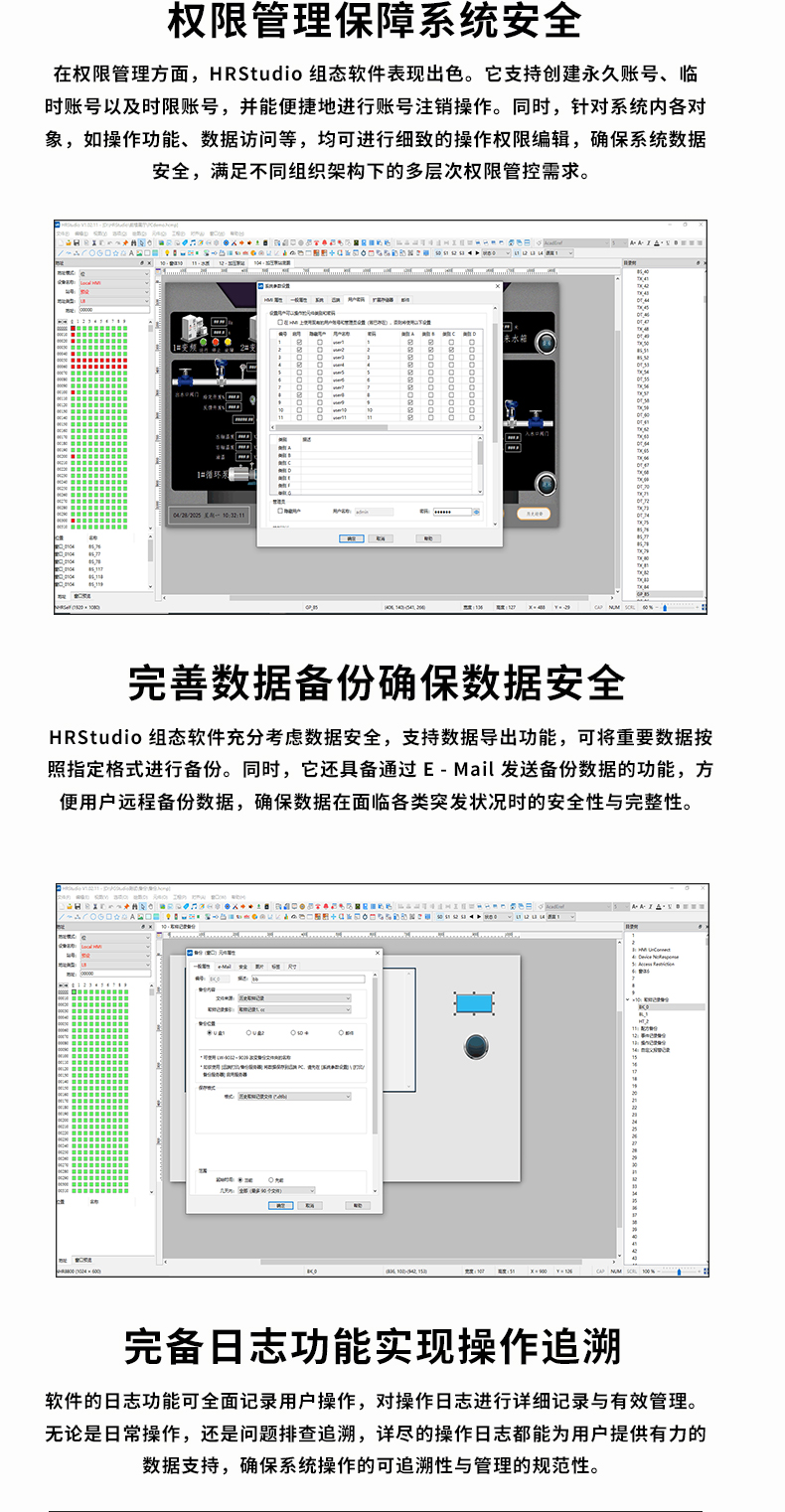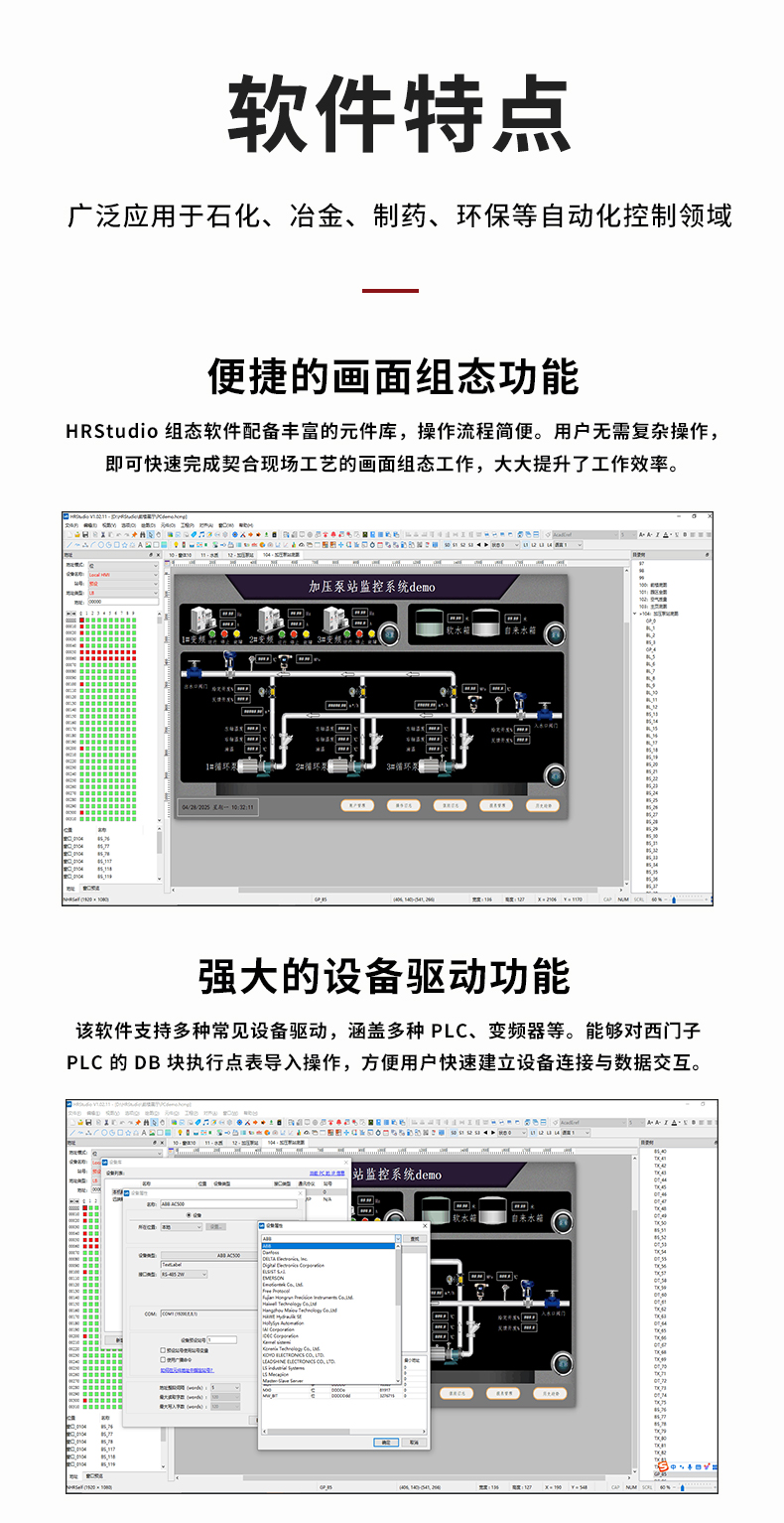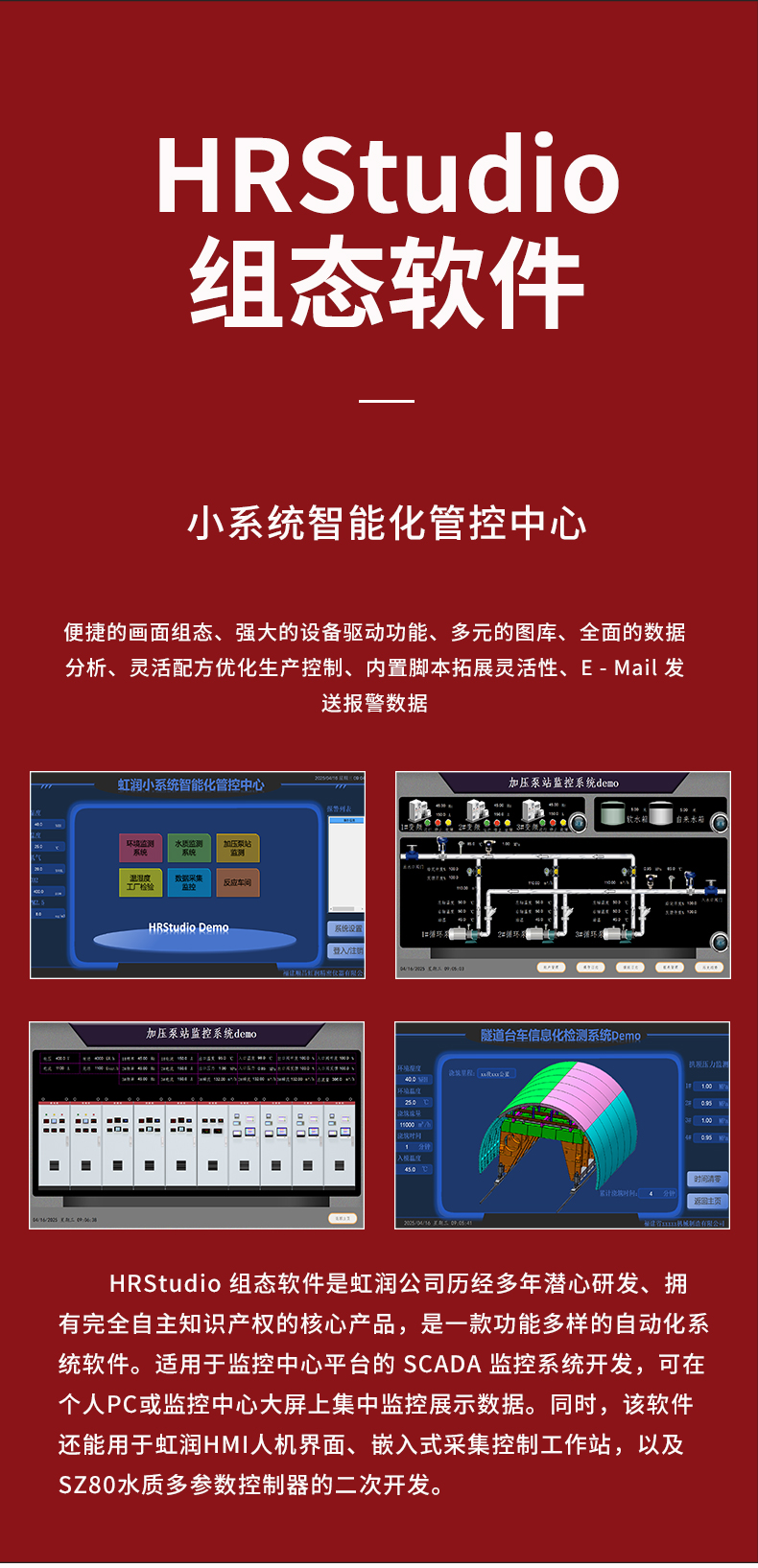 虹潤公司是專業研發組態軟件的國家專精特新“小巨人”企業。開發的HRStudio組態軟件,具有便捷組態畫面,強大設備驅動,多元化的圖庫,數據庫操作,內置腳本拓展,權限管理數據備份等特點。產品獲得嵌入式數據采集工作站組網系統等1項國家發明專利,主持起草通信系統多通道數據采集控制終端規范軍用標準,空間數據與信息數據傳輸系統等2項航天標準,以及現場設備集成等5項智能制造國家標準。參與國際5G標準制定,取得HRStudio 畫面組態 等1項相關軟件著作權。產品廣泛應用于冶金、石化、制藥、設備配套、環境監測、農業、生產過程控制等諸多領域。